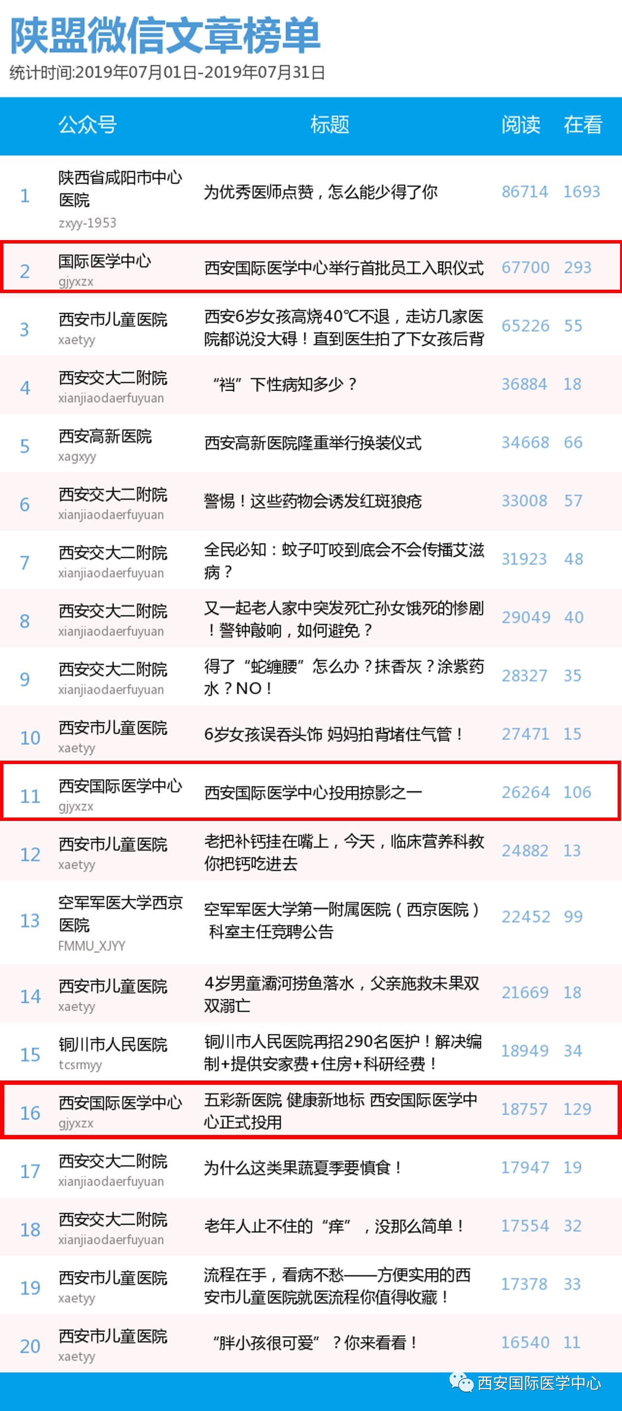 82日,中國醫(yī)療自媒體聯(lián)盟陜西分盟醫(yī)療機(jī)構(gòu)類微信公眾號7月份排行榜發(fā)布,西安國際醫(yī)學(xué)中心微信公眾號奪得醫(yī)療機(jī)構(gòu)類榜單2,高居“榜眼”。在陜西醫(yī)療自媒體聯(lián)盟的推薦下,西安國際醫(yī)學(xué)中心順利進(jìn)入今日頭條號(醫(yī)療機(jī)構(gòu)),微信文章將同步刊登到今日頭條。