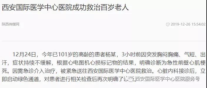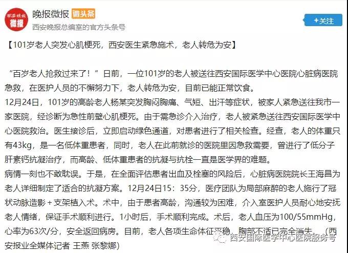 12月24日,心臟病醫(yī)院成功救治了一位101歲的老年患者。心臟病醫(yī)院CCU潘僑主任為患者在局部麻醉下行冠狀動(dòng)脈造影+支架植入術(shù)。目前,患者轉(zhuǎn)危為安,已能正常飲食。