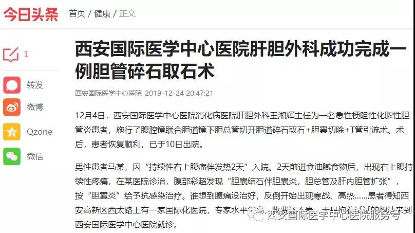 12月4日,西安國(guó)際醫(yī)學(xué)中心醫(yī)院消化病醫(yī)院肝膽外科王湘輝主任為一名急性梗阻性化膿性膽管炎患者,施行了腹腔鏡聯(lián)合膽道鏡下膽總管切開(kāi)膽道碎石取石 膽囊切除 T管引流術(shù)。術(shù)后,患者恢復(fù)良好,于10日出院。