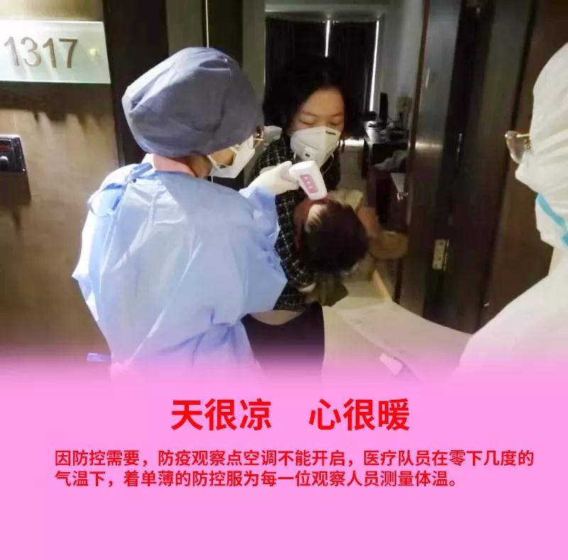 這支醫(yī)療隊(duì)由3名醫(yī)生、5名護(hù)士組成,分別是房武寧、張曉敏、王婧3位醫(yī)生;護(hù)士為白容容、陳蕓、王亞馨、燕瑞娥、田橋。身穿不透氣的防護(hù)服,醫(yī)護(hù)人員時(shí)時(shí)刻刻與時(shí)間拼耐心、與疫情變化拼細(xì)心。留觀人員中有16名70歲以上的老人,6名3歲以下的兒童。他們體質(zhì)較弱,需要更多的關(guān)懷與呵護(hù)。護(hù)士王亞馨每天要在樓上往返7、8趟為他們測(cè)體溫、安撫情緒?!拔乙矔r(shí)常想念家人,春節(jié)沒法和他們一起過年?,F(xiàn)在,這里的老人和孩子就是我的家人?!闭f著,豆大的汗珠順著她的眼睫毛滑落。即便超負(fù)荷工作著,她也從未喊過苦叫過累。