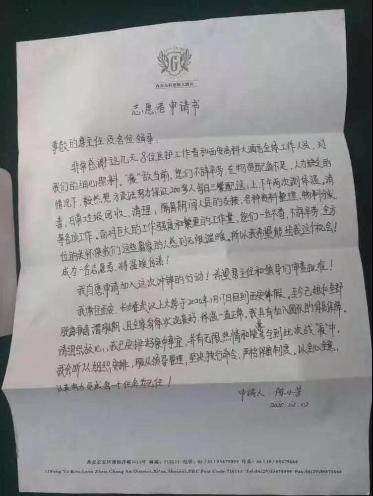 2月1日,解除留觀回家,陳小芳想當(dāng)志愿者的想法獲得了家人的鼓勵支持。緊接著,她向高新區(qū)留觀點臨時黨支部遞交了志愿者申請書。其中寫道:“面對巨大的工作強度和繁重的工作量,您們一絲不茍,不辭辛勞,全方位的關(guān)懷使我們這些離家的人感到無限溫暖。所以我希望我也能成為一名志愿者,將溫暖傳遞,我自愿申請加入這次沖鋒行動!”