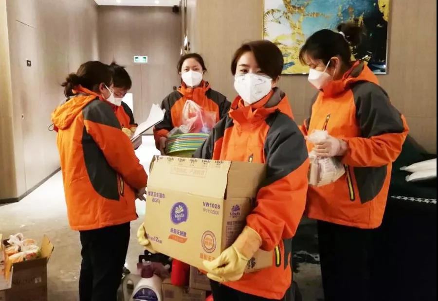 為避免人員頻繁出入,降低交叉感染風險,每個樓層固定兩名工作人員,負責全樓層30多人一日三餐的收發(fā),幾十個房間的垃圾清運處理,樓層公共區(qū)域消毒,各類生活物資清點搬運分發(fā),工作量非常大!但是這些姑娘沒有人叫苦叫累,都自稱女漢子,互相加油打氣!
