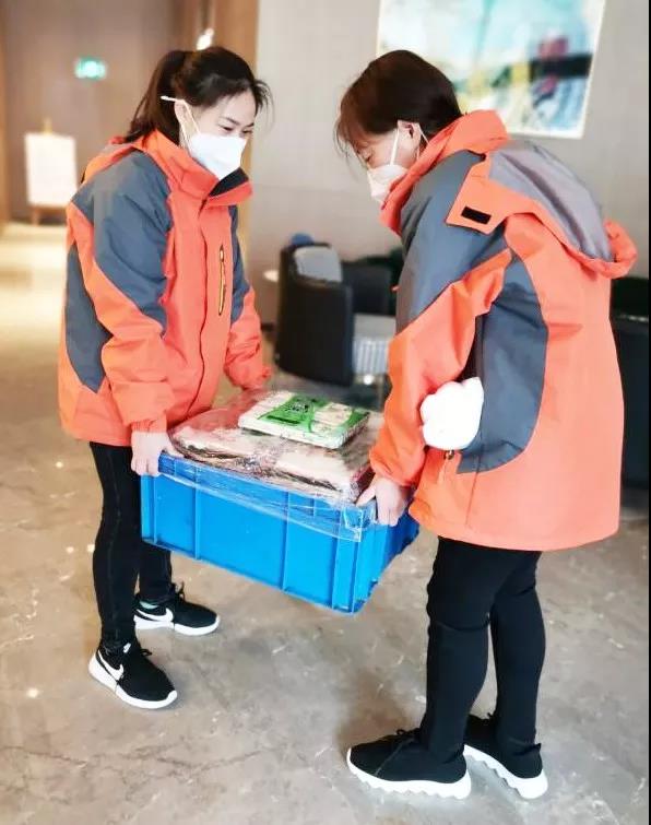 統(tǒng)一分發(fā),把飯菜送到每個房間。為了避免人員密集,駐地各樓層負責人會將飯菜從一樓集中運送至各樓層并分發(fā)到每個人房間門口的床頭柜上。并及時通知大家食用。但由于駐地工作任務多,節(jié)奏快,很多隊員不能及時就餐,細心的姑娘們會定時檢查取餐情況,及時為隊員熱上可口的飯菜。用餐后半個小時后,她們又及時將垃圾進行整理運輸?shù)骄频觊T口右邊的垃圾暫存點。