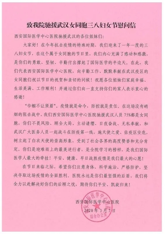 “疫”線有我,做“逆行先鋒”。疫情發(fā)生正值春節(jié)假期,西安國際醫(yī)學中心醫(yī)院從全面部署防控工作到建立聯(lián)防聯(lián)控工作機制,從醫(yī)療隊員火速馳援到醫(yī)療物資緊急保障,從正式進駐武漢第八醫(yī)院和隨州市中心醫(yī)院到全面接收新冠患者……都有女隊員們不懼危險、日夜奮戰(zhàn),同時間賽跑,與病魔較量的身影。2月2日,接陜西省衛(wèi)健委馳援武漢的指令,5個小時,1000余名女醫(yī)護人員主動請纓,遞交了請戰(zhàn)書、紅手印。腫瘤醫(yī)院副院長薛妍教授、感控部主任劉冰、總護士長倪曉慧等醫(yī)護人員舍小家、為大家,迅速出擊、臨危不懼,不計名利、不顧生死,于2月3日搭乘包機到達指定地點,令人肅然起敬,令人敬佩感動。