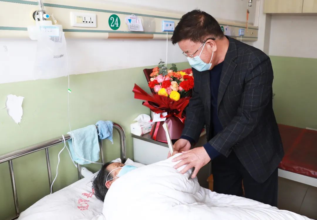 你在前方打仗,我在后方保障!醫(yī)院指派專(zhuān)人與醫(yī)療隊(duì)家屬一一對(duì)接,詳細(xì)了解前方親屬們實(shí)際困難,搭建與隊(duì)員家屬的聯(lián)系平臺(tái),第一時(shí)間了解并解決家屬們的困難。3月18日,王志峰總經(jīng)理、腫瘤醫(yī)院院長(zhǎng)南克俊教授等一行6人,驅(qū)車(chē)300多公里遠(yuǎn)赴甘肅省通渭縣人民醫(yī)院,看望85歲,有著60年黨齡,身患重病的李斌同志母親,為老人送上了慰問(wèn)品及慰問(wèn)金。