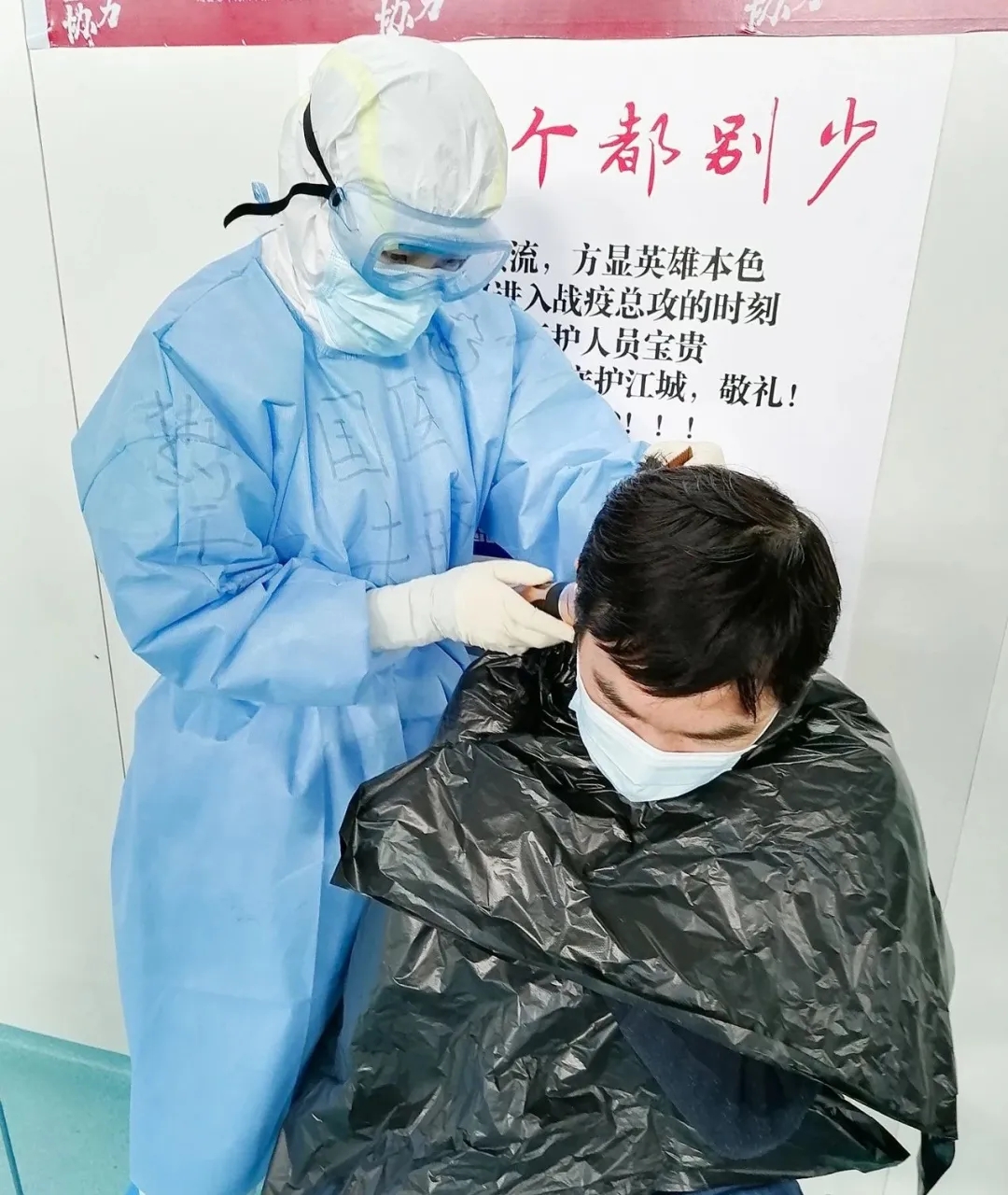 1艙有康復(fù)人員想理發(fā),手頭沒有工具,朱晴護(hù)士長得知后,聯(lián)系下個(gè)班次護(hù)士帶來推子,給大家理發(fā)?!翱茨銊?dòng)作很嫻熟啊,以前練過的吧”,“圍觀群眾”打趣道。“現(xiàn)學(xué)現(xiàn)賣,大家要求不要太高,有壓力啊!”朱晴說。一直推到推子沒電,朱晴給6位康復(fù)人員簡單修剪了頭發(fā)。得知朱晴是西安醫(yī)療隊(duì)的護(hù)士,大家都親切的稱她“肉夾饃”!