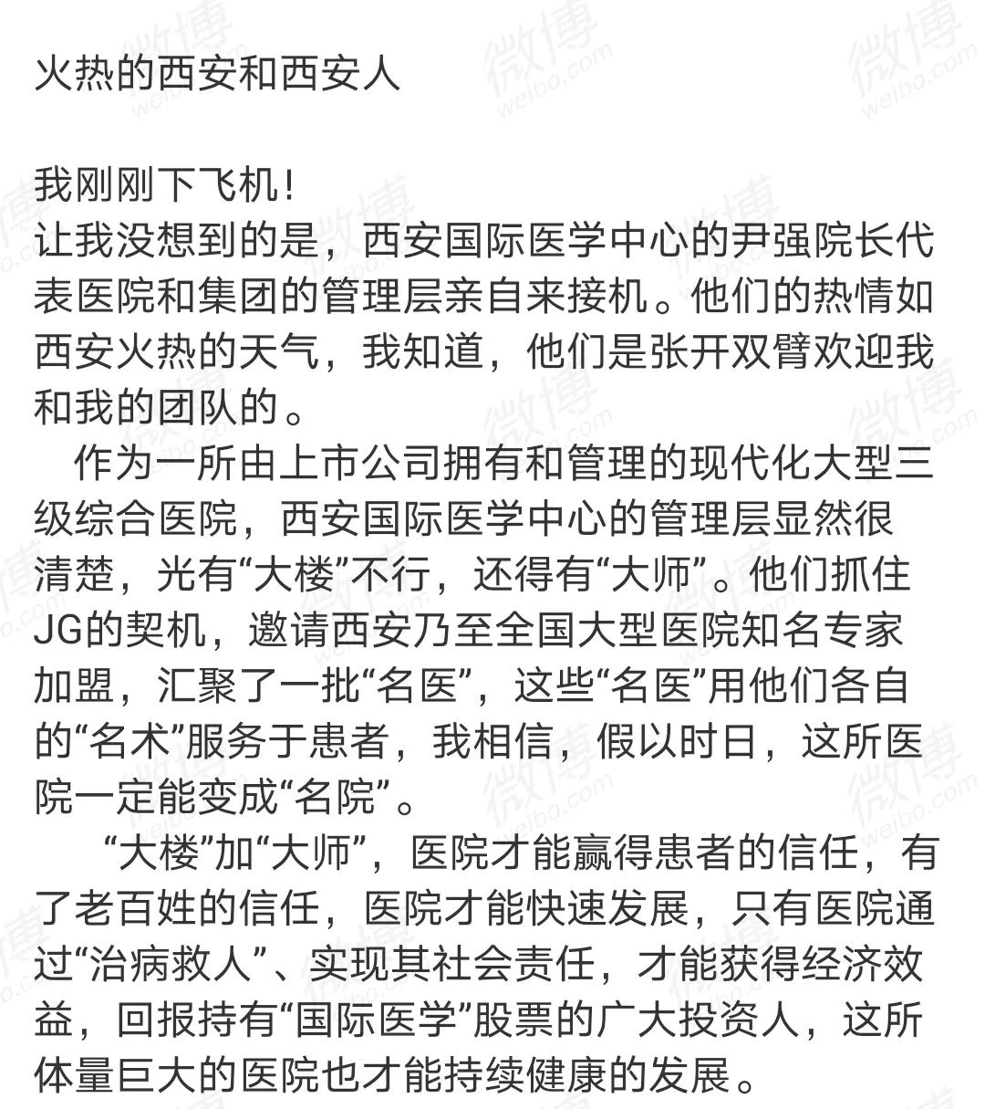 “讓我沒(méi)想到的是,西安國(guó)際醫(yī)學(xué)中心醫(yī)院的尹強(qiáng)院長(zhǎng)代表醫(yī)院和集團(tuán)的管理層親自來(lái)接機(jī),我知道,他們是張開(kāi)雙臂歡迎我和我的團(tuán)隊(duì)的。”這是郭樹(shù)忠教授加盟該院時(shí),在機(jī)場(chǎng)發(fā)布的一條微博。