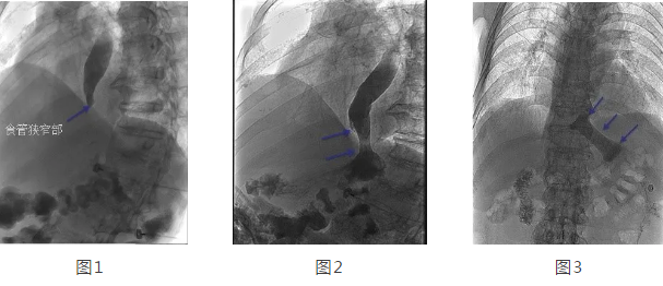 在韓國宏教授的帶領(lǐng)下,專家團(tuán)隊經(jīng)多方面評估后,決定在DSA下為劉大爺行食管造影 食管支架置入術(shù)。術(shù)中透視可見食管中上段擴(kuò)張明顯,食管下端賁門口明顯狹窄,造影劑淤積,呈線性緩慢進(jìn)入胃腔(見圖1),經(jīng)過準(zhǔn)確定位后,釋放食管支架,再次造影可見造影劑經(jīng)支架順利進(jìn)入胃腔(見圖2)。2天后再次造影見食管支架完全打開,位置正常,造影劑可順利通過支架(見圖3)。