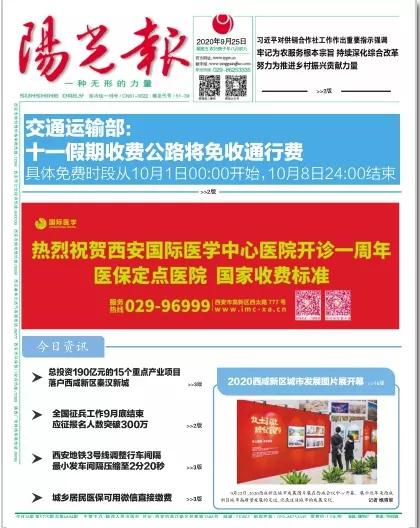 2020年9月25日,在西安國際醫(yī)學(xué)中心醫(yī)院一周歲生日之際,陜西日報(bào)、西安晚報(bào)、華商報(bào)、三秦都市報(bào)、陽光報(bào)分別刊文送上生日祝福。