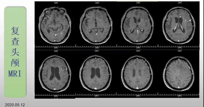 70歲的郝女士去年曾在外院查出“左額島葉”膠質(zhì)母細(xì)胞瘤(WHO Ⅳ級),并做了左側(cè)額島葉占位性病變切除術(shù)。術(shù)后進(jìn)行了同步放化療。由于治療條件有限,郝女士慕名來到我院就診。賀世明主任率領(lǐng)醫(yī)護(hù)團(tuán)隊立即為郝女士進(jìn)行了全面的檢查,決定為其進(jìn)行綜合治療 電場治療。經(jīng)過三個多月的綜合治療,患者復(fù)查頭顱MRI病變較前明顯縮小。出院時,郝女士神志清醒,睡眠飲食正常,說話很流利。“我是躺著進(jìn)來的,現(xiàn)在不用人攙扶,自己就可以走出病房了?!焙屡坷t(yī)護(hù)人員的手說。