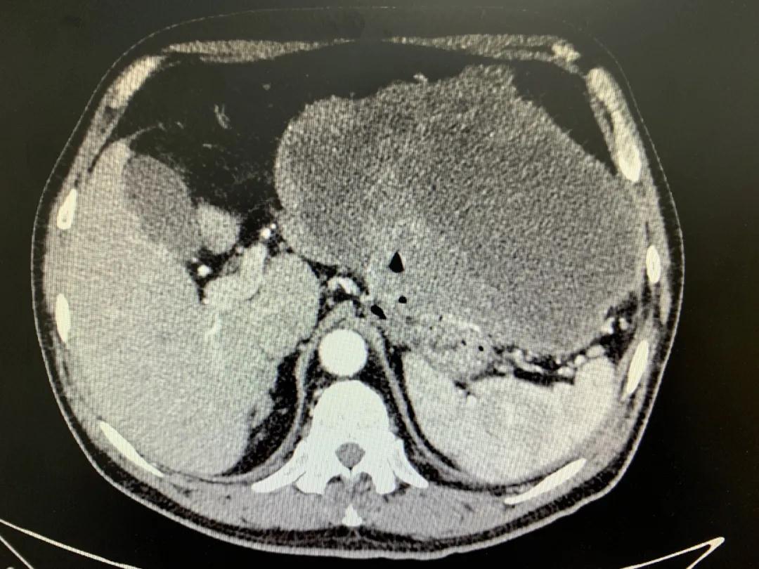 患者入院時血紅蛋白數(shù)值仍持續(xù)下降,出現(xiàn)失血性休克表現(xiàn),危及生命。消化外科二病區(qū)蔡磊主任接診后,組織科室迅速對患者進行了全面的檢查。CT提示腫瘤大小約19.3*10.3cm,腫瘤內(nèi)提示大量積血。結(jié)合相關(guān)檢查,考慮為罕見的巨大胃間質(zhì)瘤合并出血。
