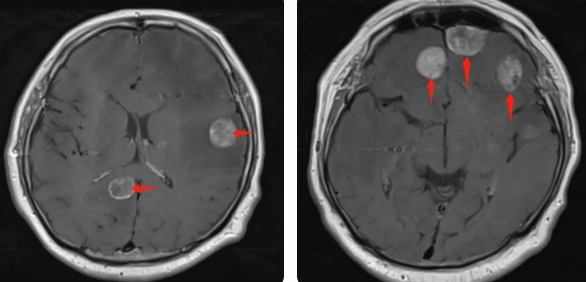 無獨(dú)有偶,60歲的左肺癌患者石先生,在外院接受了手術(shù)治療,結(jié)果術(shù)后10月出現(xiàn)腫瘤腦轉(zhuǎn)移,頭部增強(qiáng)MRI顯示:顱內(nèi)多發(fā)占位性病變伴水腫,接二連三的重?fù)糇屖壬霈F(xiàn)表情淡漠,沉默寡言,絕食等抑郁癥狀,VMAT放療技術(shù)與心理疏導(dǎo)雙管齊下,3周的治療后顱內(nèi)轉(zhuǎn)移病灶顯著縮小,部分甚至消失,困擾石先生的頭痛、頭暈癥狀也不復(fù)存在,石先生重拾對(duì)生活的希望,也對(duì)未來的治療充滿信心。
