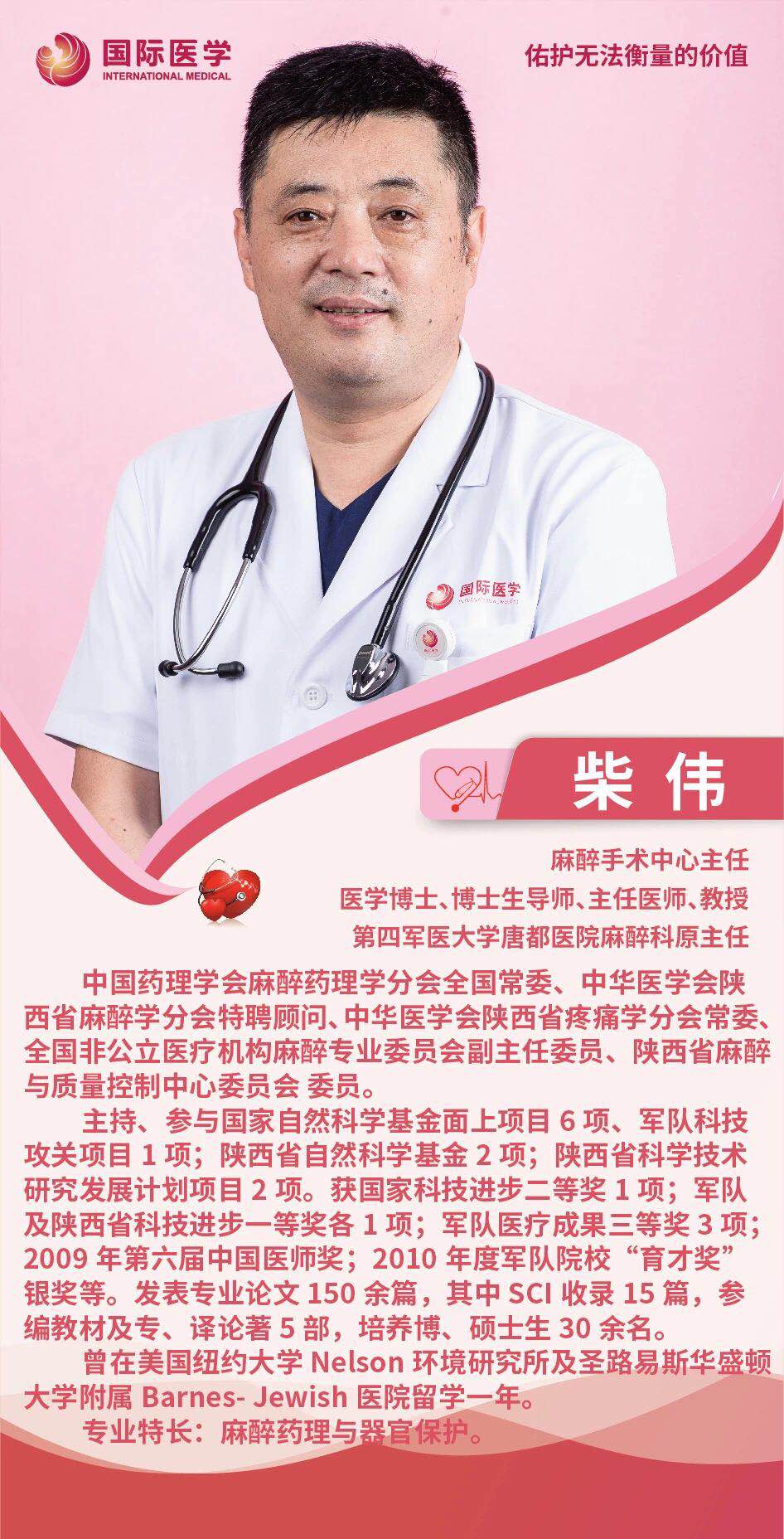 “那時,麻醉風(fēng)險比現(xiàn)在大得多!”柴偉說,才工作時,手術(shù)室里常遇到心跳驟停的患者,好在后來都搶救過來了。因此,搶救對麻醉醫(yī)生來說是得心應(yīng)手的。柴偉自信地說,在唐都醫(yī)院搶救能力最強(qiáng)的應(yīng)該是麻醉科醫(yī)生。在唐都醫(yī)院,柴偉一路晉升為副主任醫(yī)師、主任醫(yī)師,副教授、教授,并且負(fù)責(zé)麻醉科全面工作20年。越來越多的橄欖枝拋向他——1986年在北京協(xié)和醫(yī)院麻醉科進(jìn)修心臟外科麻醉一年,先后赴日本、加拿大等多國進(jìn)修交流。2006年,由國家基金委委派,他做訪問學(xué)者在美國紐約大學(xué)和華盛頓大學(xué)訪問一年。他主持和參與國家自然科學(xué)基金面上項目6項,軍隊及省部級課題5項。獲國家科技進(jìn)步二等獎1項、軍隊及陜西省科技進(jìn)步一等獎各1項,獲軍隊醫(yī)療成果三等獎3項。獲得中國醫(yī)師獎及軍隊院?!坝弄劇便y獎。發(fā)表論文150余篇,其中SCI收錄15篇;參編著作5部。此外,柴偉還擔(dān)任《臨床麻醉雜志》和《中華麻醉學(xué)雜志》通訊編委,國家衛(wèi)生部主管的醫(yī)學(xué)參考報麻醉學(xué)頻道編委。