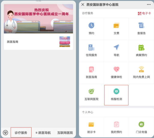 有需要住院、陪護(hù)的應(yīng)檢盡檢或愿檢盡檢人群,可關(guān)注“西安國際醫(yī)學(xué)中心醫(yī)院服務(wù)號(hào)”后,在【診療服務(wù)】——【核酸檢測(cè)】功能中自助開單,支付后前往西安國際醫(yī)學(xué)中心醫(yī)院急診門口預(yù)檢分診點(diǎn)北側(cè)核酸檢測(cè)室完成采樣檢測(cè)。檢測(cè)結(jié)果可在西安國際醫(yī)學(xué)中心醫(yī)院服務(wù)號(hào)——【診療服務(wù)】——【查報(bào)告】中查看,也可在“西安市民一碼通”——【核酸結(jié)果查詢】中查看。