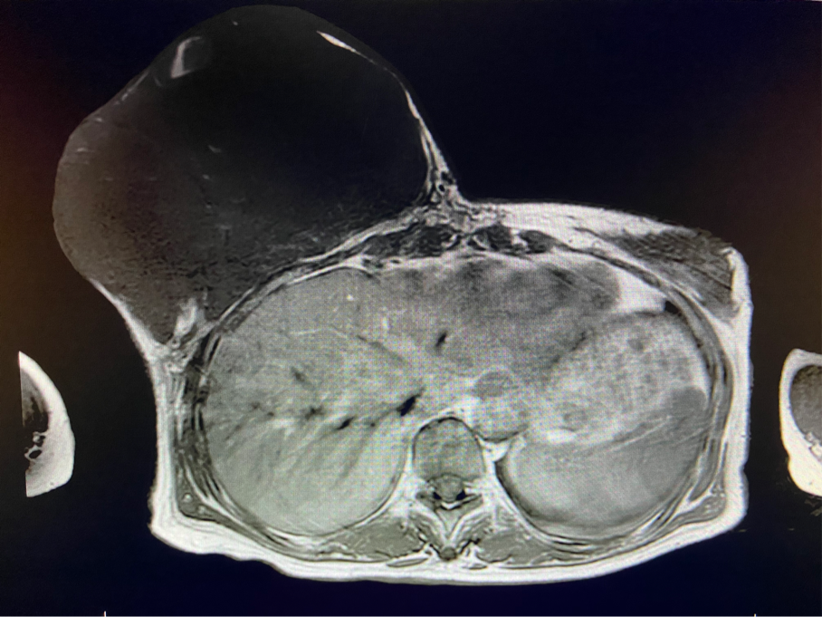該患者右乳巨大腫物術(shù)前初步考慮乳腺葉狀腫瘤可能,因腫瘤太大,幾乎遍及整個(gè)右側(cè)乳房,為保證“無瘤原則”,術(shù)中切除范圍位置未知,極有可能出現(xiàn)皮瓣缺損。于是,經(jīng)過和整形醫(yī)院郭樹忠院長(zhǎng)、整形外科王愛武主任的討論,提供了兩種手術(shù)方式,一是創(chuàng)面修復(fù)(植皮或轉(zhuǎn)移皮瓣修復(fù)創(chuàng)面),二是乳房再造,與患者及家屬溝通后,決定先解決腫物,3年病情不再?gòu)?fù)發(fā)后,可以再考慮乳房重建。