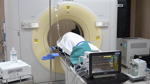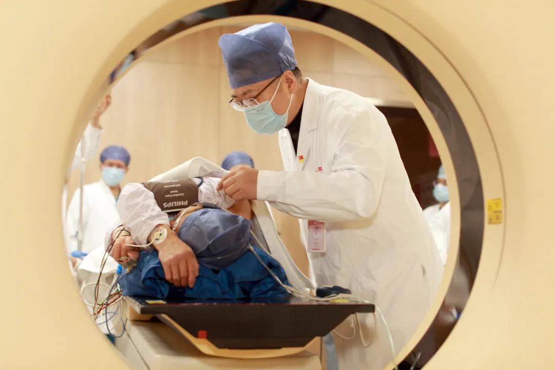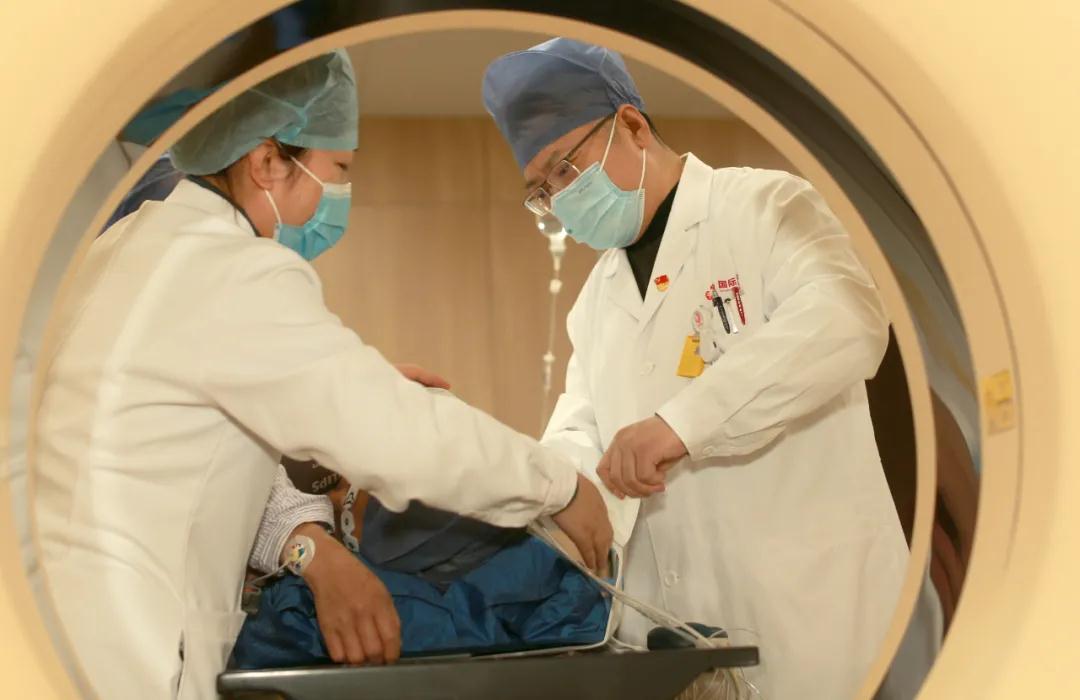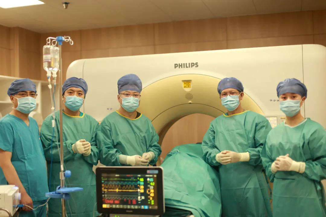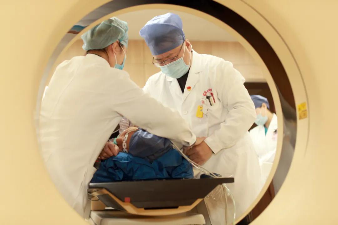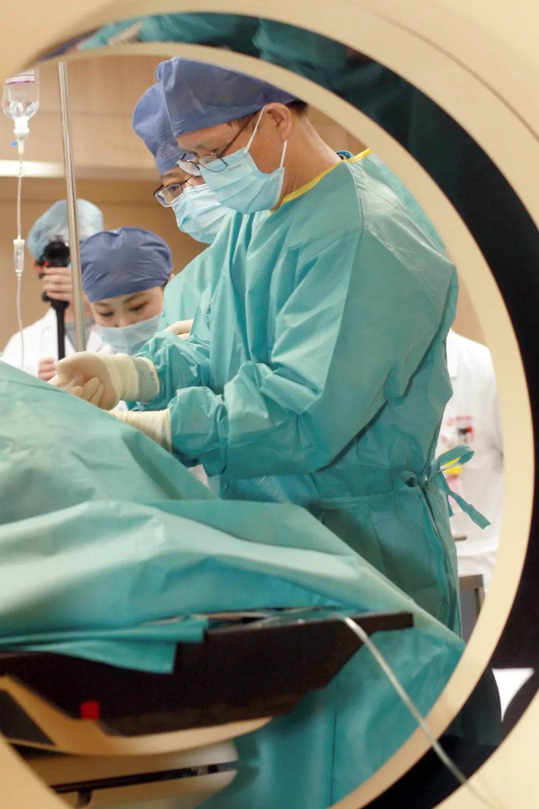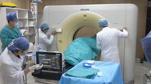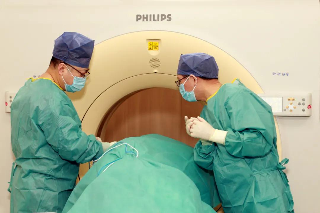 經(jīng)過(guò)放射治療中心陸軍主任的細(xì)致準(zhǔn)備與精準(zhǔn)定位,屈女士的射頻治療開(kāi)始了?;颊卟扇∽髠?cè)臥位,麻醉醫(yī)生立即進(jìn)行靜脈全麻。在CT引導(dǎo)下,醫(yī)生手中的“消融針”,按照既定路線“穿引”,快速、準(zhǔn)確地插入右肺病灶部位,啟動(dòng)射頻機(jī)器進(jìn)行了精準(zhǔn)的消融,右肺局部癌細(xì)胞一下子就被超高溫成功滅活了!經(jīng)CT掃查,無(wú)血?dú)庑兀换颊呱w征平穩(wěn)。2個(gè)小時(shí)后,屈女士就下地活動(dòng)了。