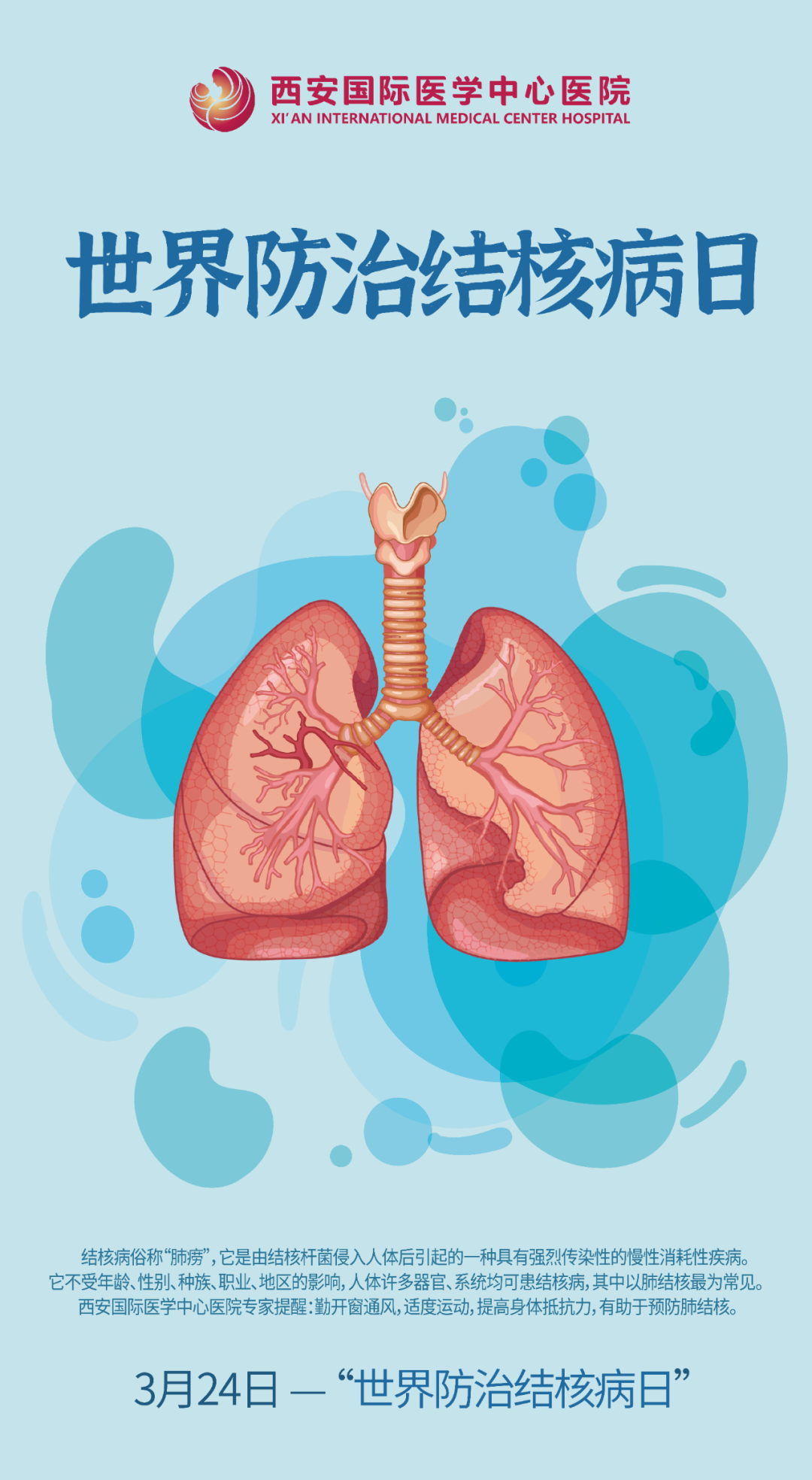 2021年3月24日是第26個世界防治結(jié)核病日,今年我國的宣傳主題是:“終結(jié)結(jié)核流行、自由健康呼吸”。作為呼吸道傳染病,肺結(jié)核究竟是什么?對我們的身體有哪些危害?今天,預(yù)防保健科閆蓓醫(yī)生為大家介紹相關(guān)知識。