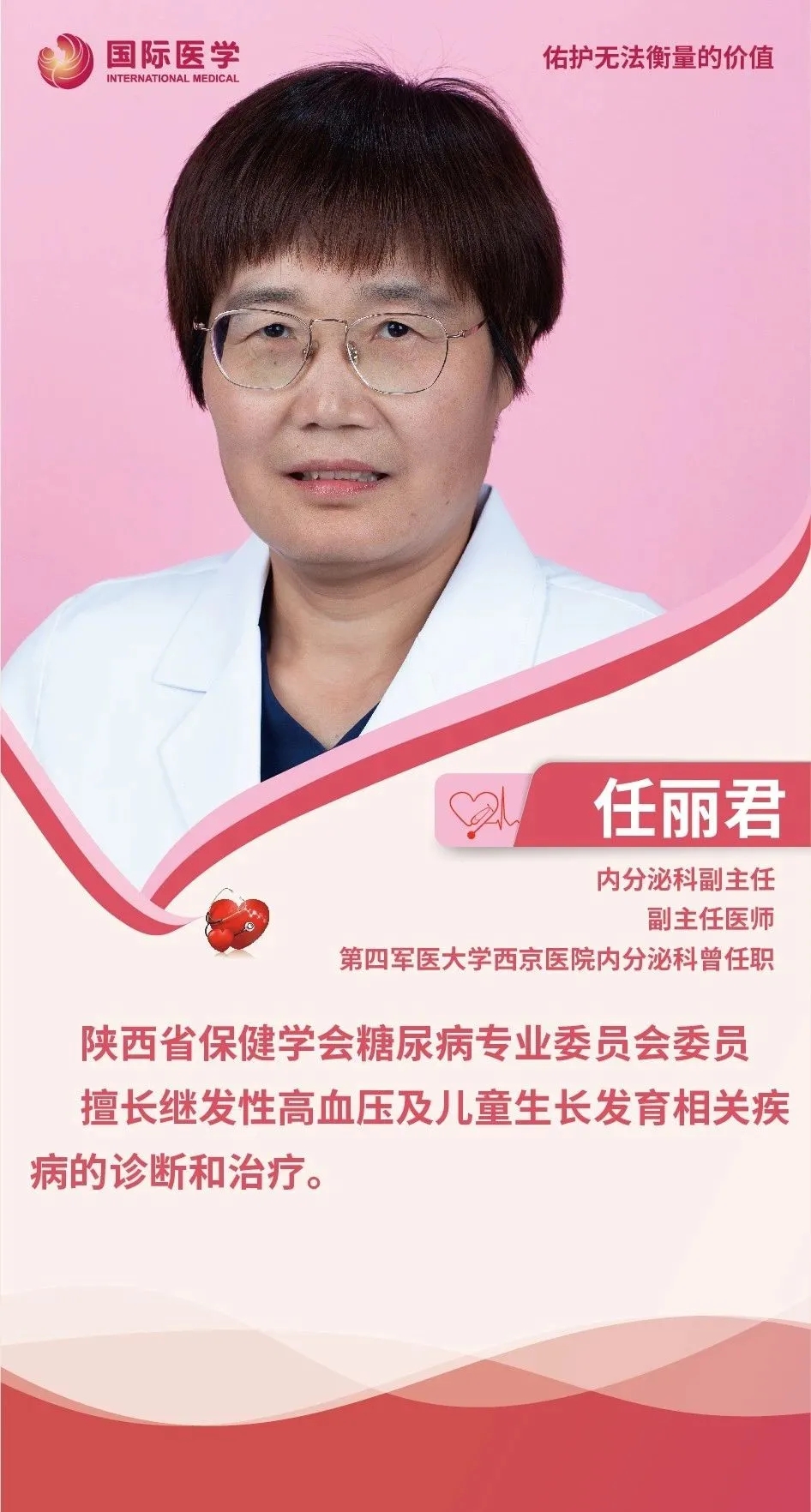 生命之重,重于千金,醫(yī)生是捍衛(wèi)生命的守護(hù)神,救死扶傷是醫(yī)生畢生追求的信念。從披上白衣成為一名內(nèi)分泌科醫(yī)生的那一刻起,“對(duì)生命負(fù)責(zé)”這一響亮的口號(hào),就成為她工作的源泉和動(dòng)力。她的肩上就擔(dān)負(fù)起“責(zé)任”和“挑戰(zhàn)”兩項(xiàng)重任。在她看來(lái),患者的需求就是醫(yī)者努力的方向。她就是西安國(guó)際醫(yī)學(xué)中心醫(yī)院內(nèi)分泌科副主任任麗君。