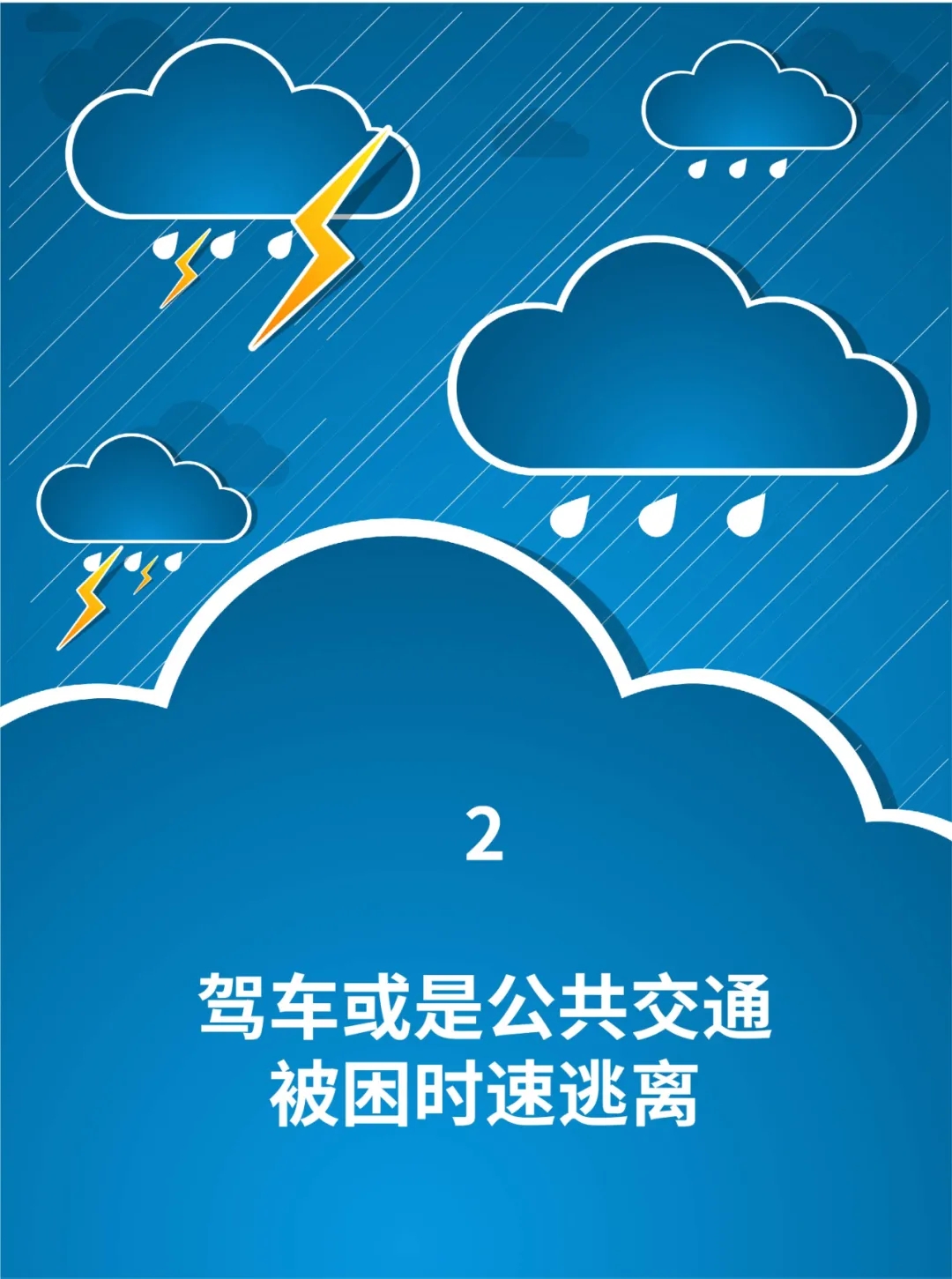 地鐵站、地下停車場、地下通道、下坡、下沉式立交橋下等低洼地段以及有橋梁、有漩渦的地方很危險。遠離老舊建筑、電線桿、廣告牌、路燈。遠離高壓線、高壓電塔、變電器,電閘、配電箱等電力設(shè)施及有供電危險標志的一切物品。