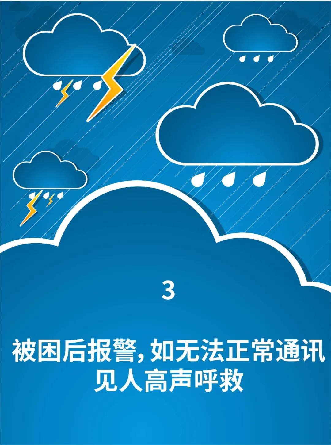 如果自己被困,可立刻向警方匯報自己所處位置、有多少人、周圍水情、緊急通訊方式等,然后停止使用手機,等待救援。如手機沒電,與外界失去聯(lián)系,見到人要高聲呼救,敲擊身邊的物體,利用一切能發(fā)光、鮮艷的物體吸引救援人員注意。
