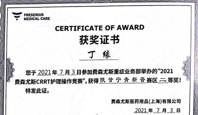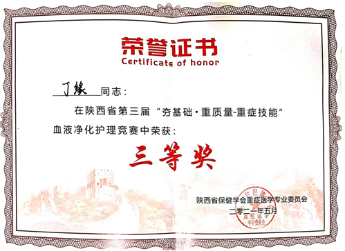 2021年5月,陜西省保健學會重癥醫(yī)學專業(yè)委員會舉辦了第三屆《“夯基礎?重質量-重癥技能”血液凈化護理技能競賽》。丁緣經(jīng)過激烈角逐,從陜西省21家醫(yī)院的24名選手中脫穎而出,榮獲三等獎,拿到了全國聯(lián)賽的入場券。