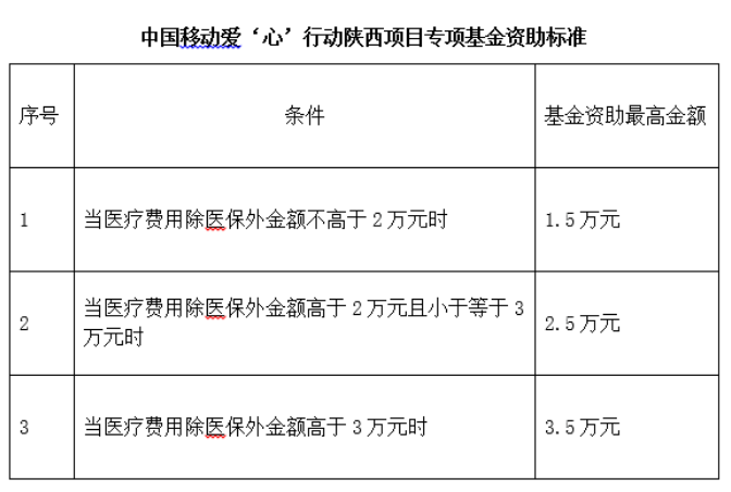 (三)項(xiàng)目實(shí)行“屬地醫(yī)保 慈善捐助 合作醫(yī)院減免”三結(jié)合的全額資助模式,受助患兒應(yīng)在合作醫(yī)院首先進(jìn)行醫(yī)保結(jié)算;醫(yī)保結(jié)算剩余部分,由中國移動(dòng)愛‘心’行動(dòng)專項(xiàng)基金按最高限價(jià)標(biāo)準(zhǔn)進(jìn)行結(jié)算,其余超出治療費(fèi)用由合作醫(yī)院減免,同一救助對象1年內(nèi)只給予一次救助。