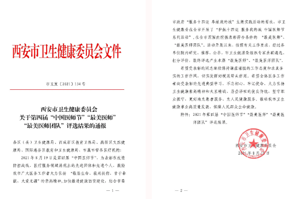 西安高新區(qū)文旅健康局表彰了西安高新區(qū)2021年最美醫(yī)師團隊、最美醫(yī)師。呼吸內(nèi)科二病區(qū)醫(yī)師團隊、神經(jīng)外科醫(yī)師團隊榮獲西安高新區(qū)2021年最美醫(yī)師團隊,董文婷、常亮、楊磊、張安生榮獲西安高新區(qū)2021年最美醫(yī)師。