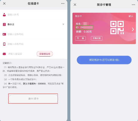 (1)沒有就診卡的人員,請輸入個人信息完成就診卡綁定。綁卡后,獲得個人ID號。(如右圖所示)
