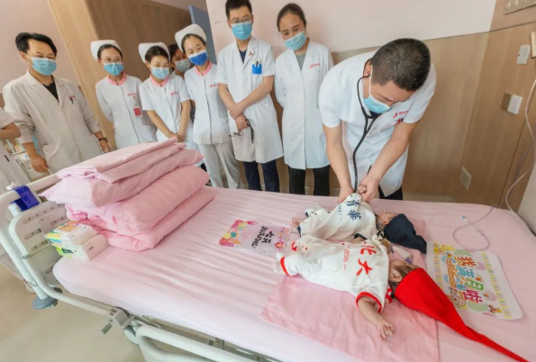“樂(lè)樂(lè)、朵朵(均為化名)長(zhǎng)大了上清華、北大……”西安國(guó)際醫(yī)學(xué)中心醫(yī)院心臟外科病房傳出陣陣歡笑,兩個(gè)剛滿月的寶寶分別身著“清華”、“北大”連體衣,并排躺在病床上,接受來(lái)自家人和醫(yī)護(hù)人員的祝福。