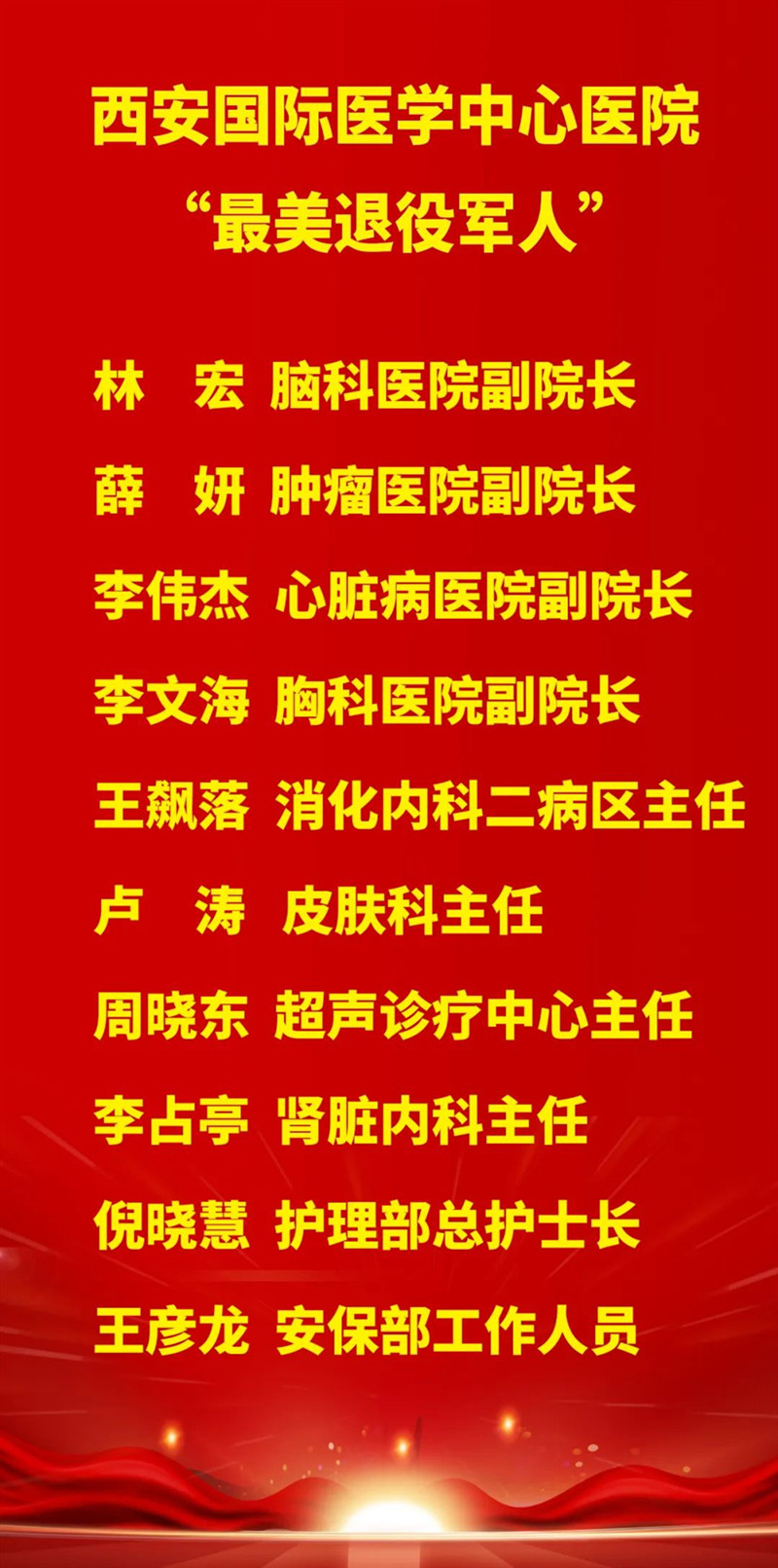 李武平副院長(zhǎng)宣讀了表彰名單,林宏、薛妍、李偉杰、李文海、王飆落、盧濤、周曉東、李占亭、倪曉慧、王彥龍10名同志被評(píng)為“西安國(guó)際醫(yī)學(xué)中心醫(yī)院最美退役軍人”。