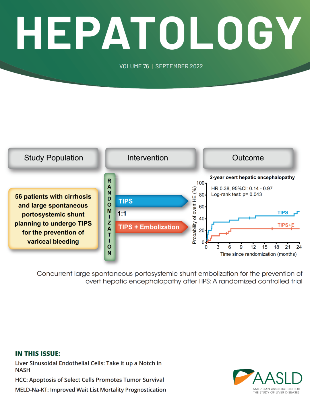 新近,西安國際醫(yī)學中心醫(yī)院消化病醫(yī)院韓國宏教授團隊的一項隨機對照試驗“經(jīng)頸靜脈肝內(nèi)門體靜脈分流術(shù)(TIPS)聯(lián)合自發(fā)性門體分流封堵預防術(shù)后顯性肝性腦病”的論著被最新一期的Hepatology雜志(IF=17.29,JCR:Q1)遴選為9月份封面文章(圖1)。該研究顯示TIPS聯(lián)合粗大分流道封堵能夠有效降低TIPS術(shù)后顯性肝性腦病的發(fā)生率,且不增加門靜脈高壓、分流道功能障礙和其他不良事件的并發(fā)癥風險[1]。