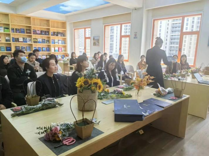 活動(dòng)特邀了專(zhuān)業(yè)的花藝?yán)蠋煟F(xiàn)場(chǎng)為大家進(jìn)行講解和指導(dǎo)?;ㄋ?yán)蠋熢敿?xì)講解了各種花卉所蘊(yùn)含的花語(yǔ)及插花技巧,大家發(fā)揮想象力,用自己靈巧的雙手,將經(jīng)過(guò)修剪的向日葵、非洲菊、康乃馨等多種花材,根據(jù)不同的色彩、形狀有層次地搭配在一起,在馥郁花香中感悟取舍之道、領(lǐng)會(huì)古雅之美。