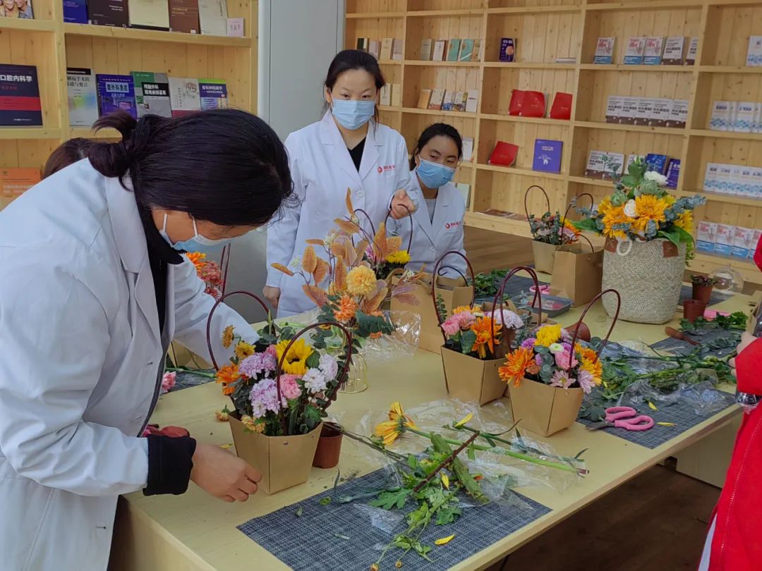 在插花過(guò)程中,每個(gè)人臉上都洋溢著幸??鞓?lè)的笑容,在插花勞作中尋找樂(lè)趣,從作品欣賞中獲得滿(mǎn)足,在相互交流中拉近距離。五顏六色的花材在大家手中被賦予了新的生命和寓意,呈現(xiàn)出一件件清新怡人的花藝作品。此刻,無(wú)論媽媽、妻子、女兒,還是醫(yī)生、護(hù)士,雖然角色不一樣,但都沉浸在專(zhuān)注花藝的體驗(yàn)中。