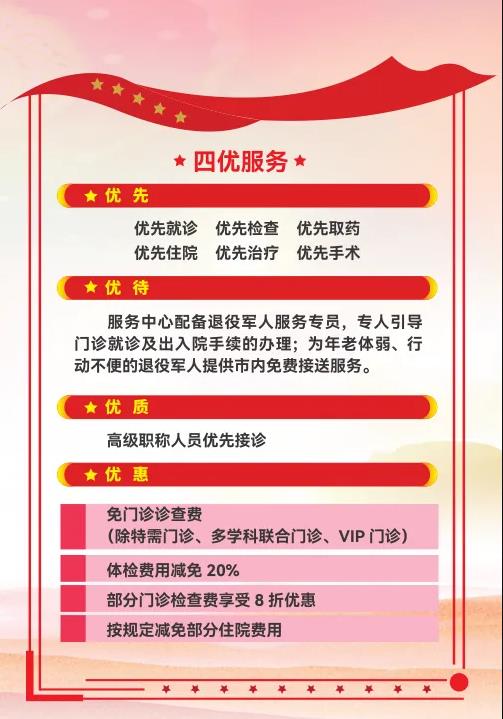 長(zhǎng)期以來(lái),醫(yī)院把“尊崇軍人,致敬軍屬”落到實(shí)處。一是對(duì)退役軍人實(shí)行優(yōu)撫。對(duì)退、現(xiàn)役軍人及其配偶和未成年子女;因公犧牲軍人直系親屬;軍隊(duì)離退休干部及退休士官;在鄉(xiāng)退伍紅軍老戰(zhàn)士、在鄉(xiāng)西路軍紅軍老戰(zhàn)士、“三紅”人員;殘疾軍人;在鄉(xiāng)復(fù)員軍人等優(yōu)撫對(duì)象來(lái)院享受門(mén)診就診優(yōu)先;住院優(yōu)先;窗口手續(xù)辦理優(yōu)先;檢驗(yàn)檢查優(yōu)先;城區(qū)范圍內(nèi)救護(hù)車(chē)免費(fèi)接送(預(yù)約電話:029—966120);特殊人員一對(duì)一陪診。二是優(yōu)撫對(duì)象就診時(shí)享受免門(mén)診診查費(fèi);部分門(mén)診檢查費(fèi)享受8折優(yōu)惠;體檢費(fèi)用減免20%;按規(guī)定減免部分住院費(fèi)用。